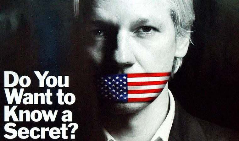 Poster of image of Julian Assange with the flag of the USA as a gag on him. (Image source: Internet)