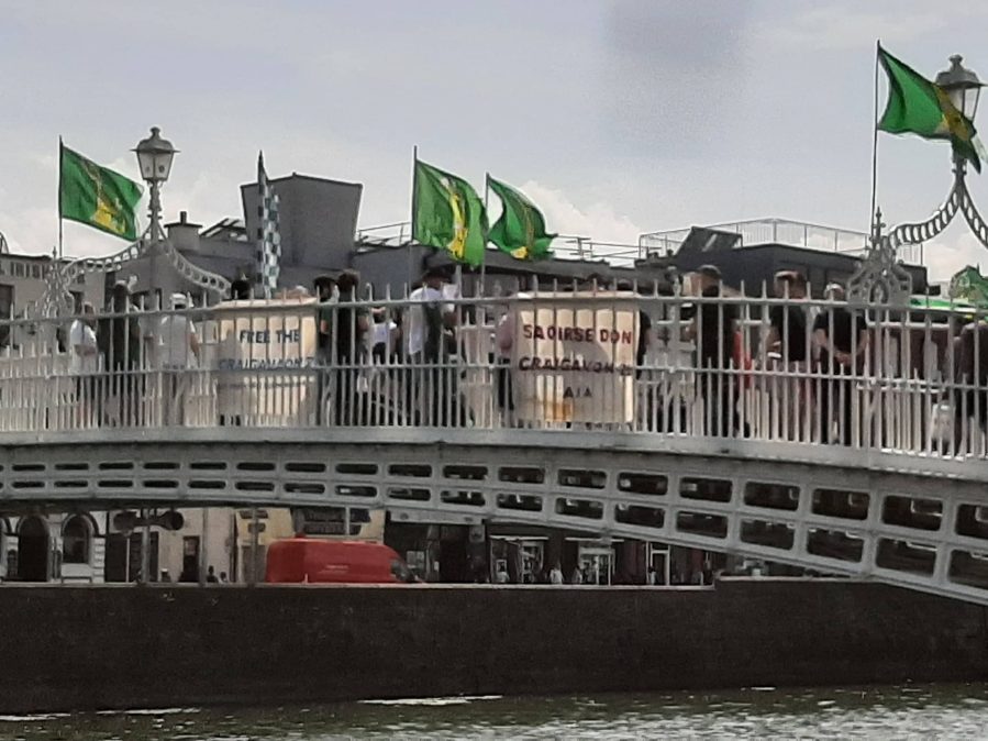 In Dublin city centre banners in Irish and in English calling for the freeing of the Craigavon Two were hung from the iconic curved pedestrian Ha’penny Bridge. Green and gold Starry Plough flags streamed in the breeze from the sea as leaflets were distributed to passers-by.