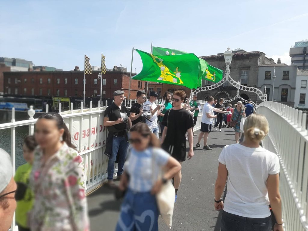 Leaflets being distributed and placards displayed on the Ha’penny Bridge, Dublin on the 16th. (Photo sourced: AIA)