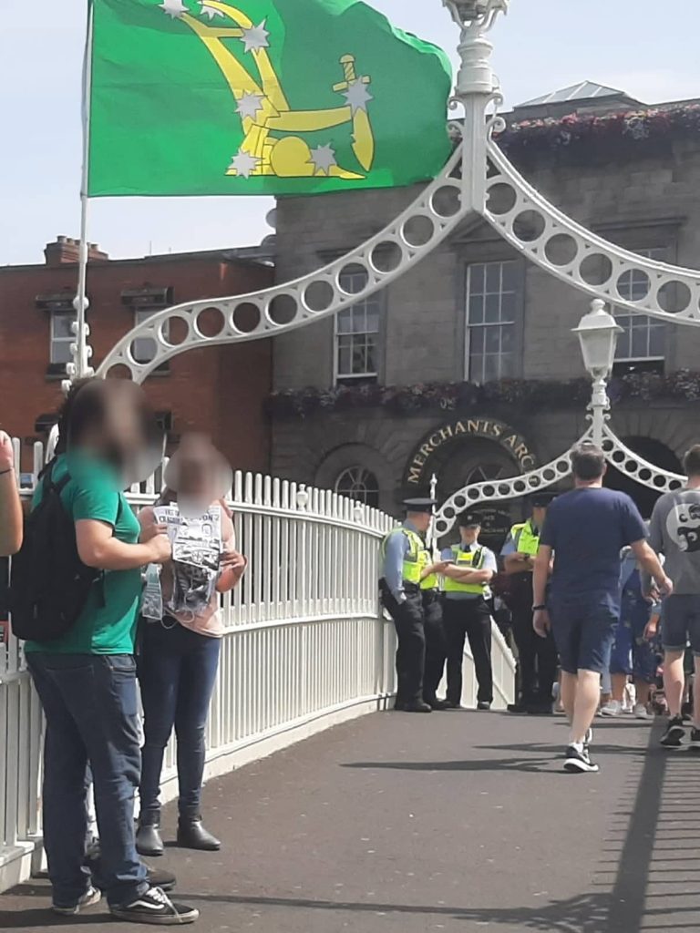 Gardaí watching the awareness-raising picket on the Ha’penny Bridge on the 16th. (Photo sourced: AIA)