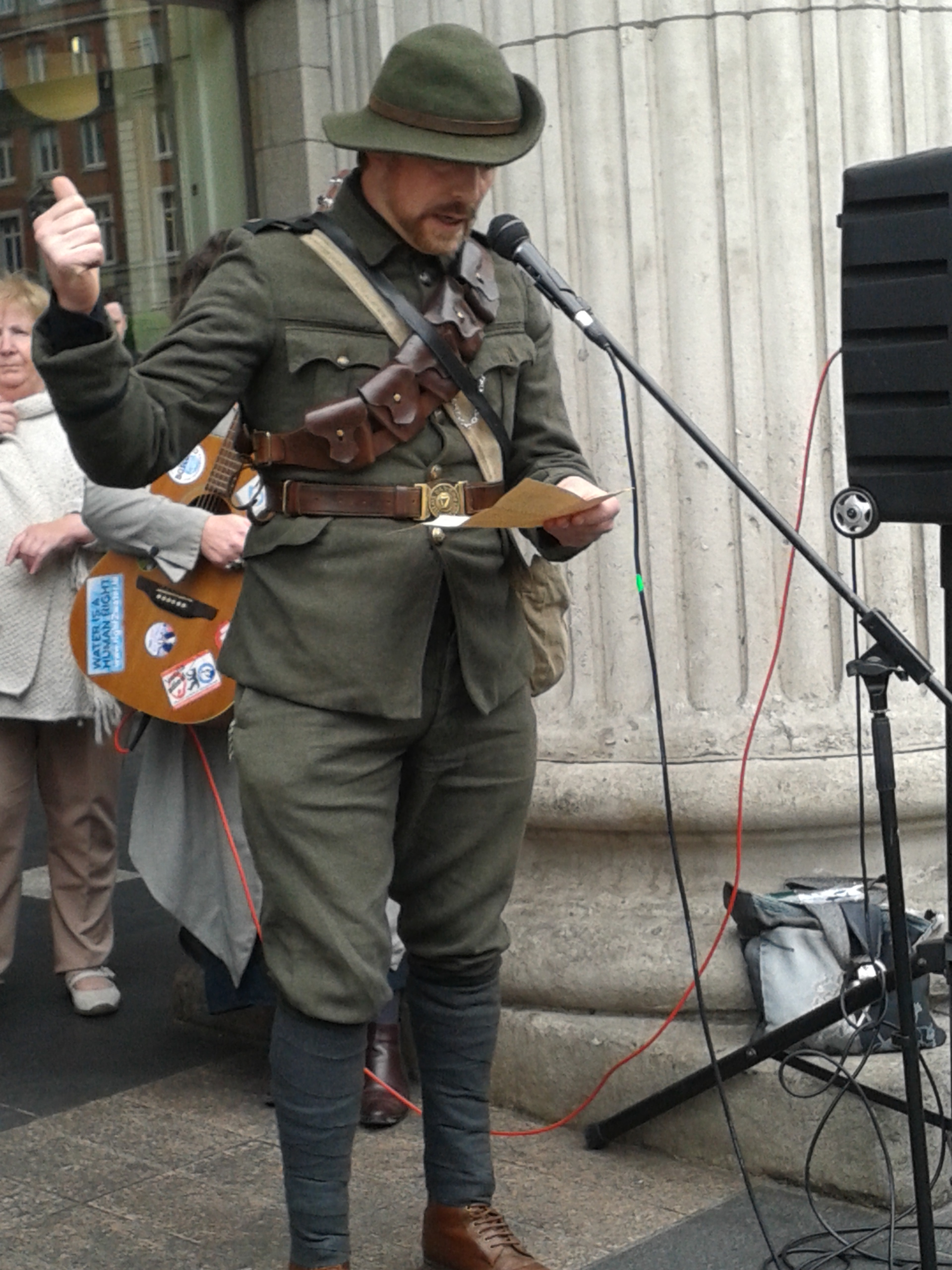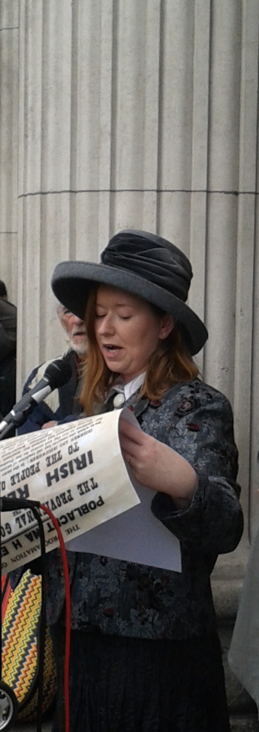This was followed by Fiona Nichols, in period costume, reading the Proclamation and after that came Dave Swift in Irish Volunteer costume, reading a message given by a wounded James Connolly (he had been injured Thursday of Easter Week by a ricochet in Williams Lane while on a reconnaissance mission).