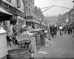 The giant shopping ‘mall’ intended acreage in dark blue and the existing ILAC spread in green (which has buried a number of streets and laneways of the old street market quarter). Famous photograph taken presumably from GPO roof, showing how busy the market used to be just a few decades ago. Even then, conditions for the street sellers were hard with no alleviation by Dublin City Council. (Photo source: Internet)
