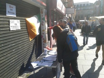 The small shopkeepers are not without their own problems in the street. Most of them are on annual contracts (or even shorter, such as three months), subject to having their business in the street closed at the wish of the property speculators. The ILAC extension currently underway at the south end of the building resulted in the eviction of around ten businesses, most of which received no alternative site. Even the presence of a narrow vegetable produce rack outside a shop can bring down a threat or an actual fine from the Market Inspectors, while ugly hoardings approved by Dublin City Council squeeze the street and restrict the flow of pedestrians.