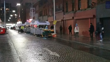 Photo of fruit stall at the intersection of Moore Street and Henry Place (start of the 16 buildings of ‘the 1916 Terrace’) taken on a considerably warmer day. Most of the lighting is from the nearby Asian buffet restaurant. (Photo: D. Breatnach)