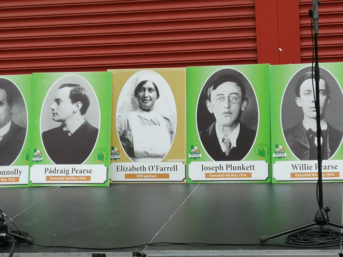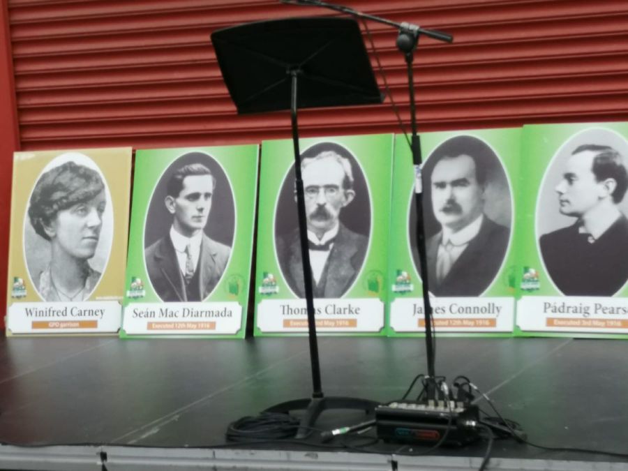 Warfield performed in front of a number of large board posters bearing the images of a number of leaders of the 1916 Rising who had occupied Moore Street in 1916 and Vols. Elizabeth O’Farrell and Winifred Carney, two of the three women Volunteers who had been part of the garrison.