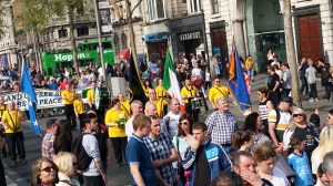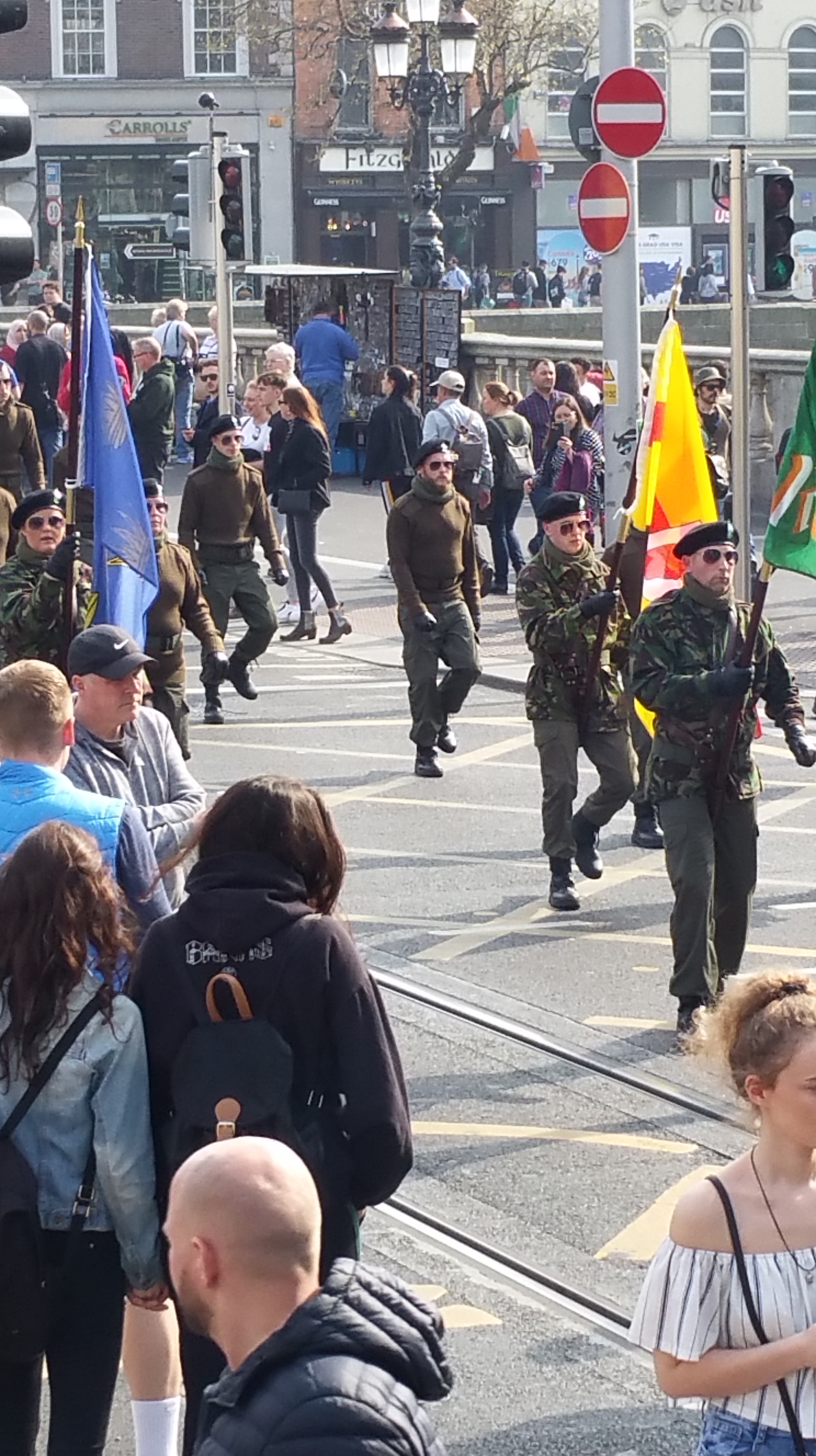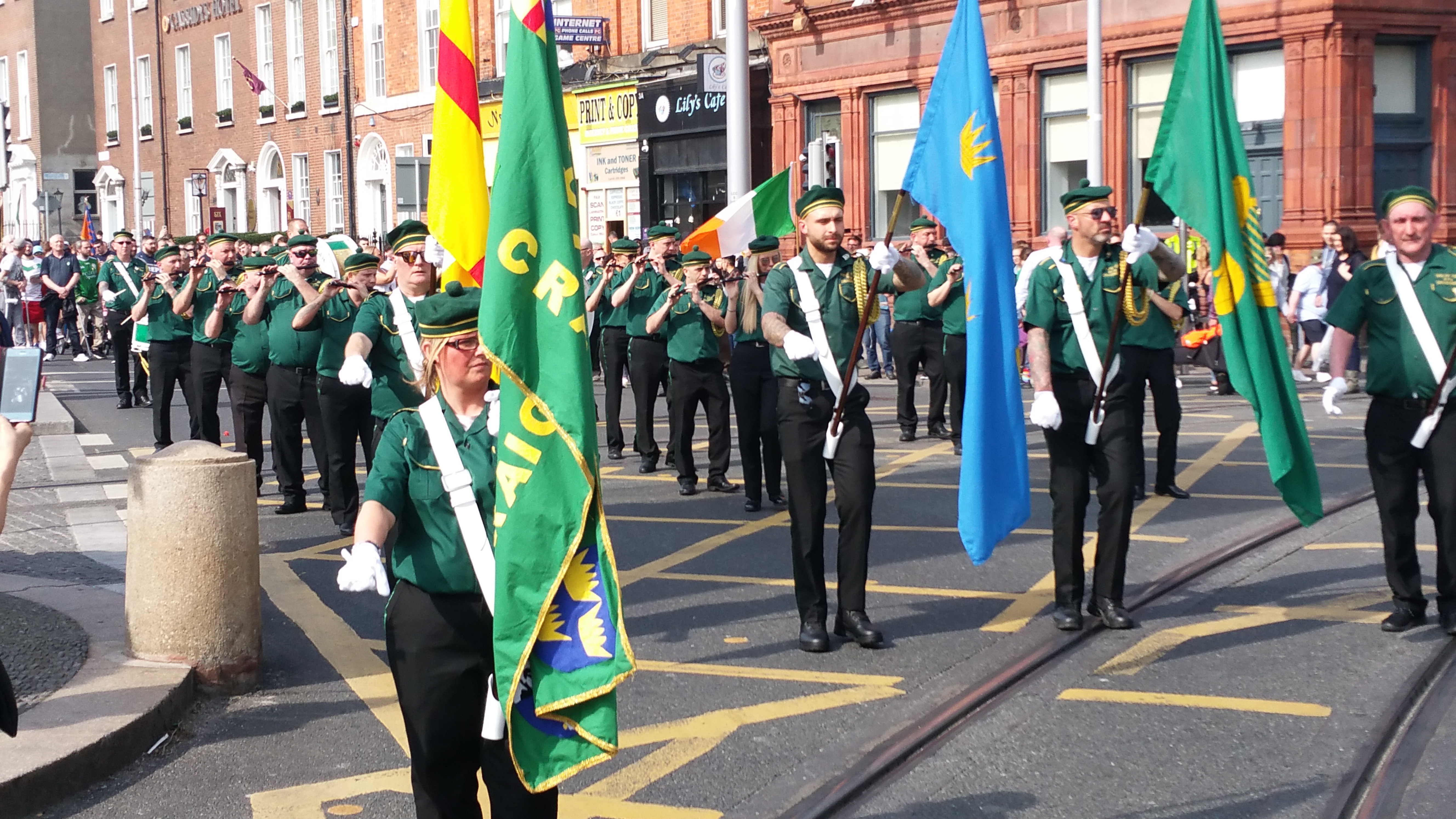 The participants declined to be intimidated and set off on their march, led by a lone piper playing Irish marching airs, followed by a colour party with different banners interspersed among the marchers, among which fluttered many flags.