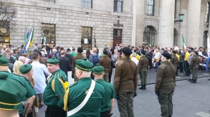 Floral tributes were laid by representatives of a number of announced organisations and then others came forward to lay floral tributes also. The colour party lowered flags for a minute’s silence in homage and salute before slowly raising them again and the piper played Amhrán na bhFiann.