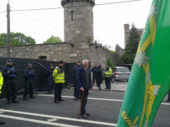Participants in the event met this morning at Phibsboro Shopping Centre and marched along Phibsborough Road towards Glasnevin cemetery, carrying banners, flags and two floral sprays. Led by a banner carrying the legend which Connolly had erected over Liberty Hall during WW1, “We Serve Neither King nor Kaiser”, they passed over Cross Guns Bridge on the Royal Canal and on towards Glasnevin Cemetery, heading for the Hunger Strike Memorial there. However they found their way barred by a metal screen and blackout material, fronted by Riot police and other Gardaí with mounted police also being brought up.