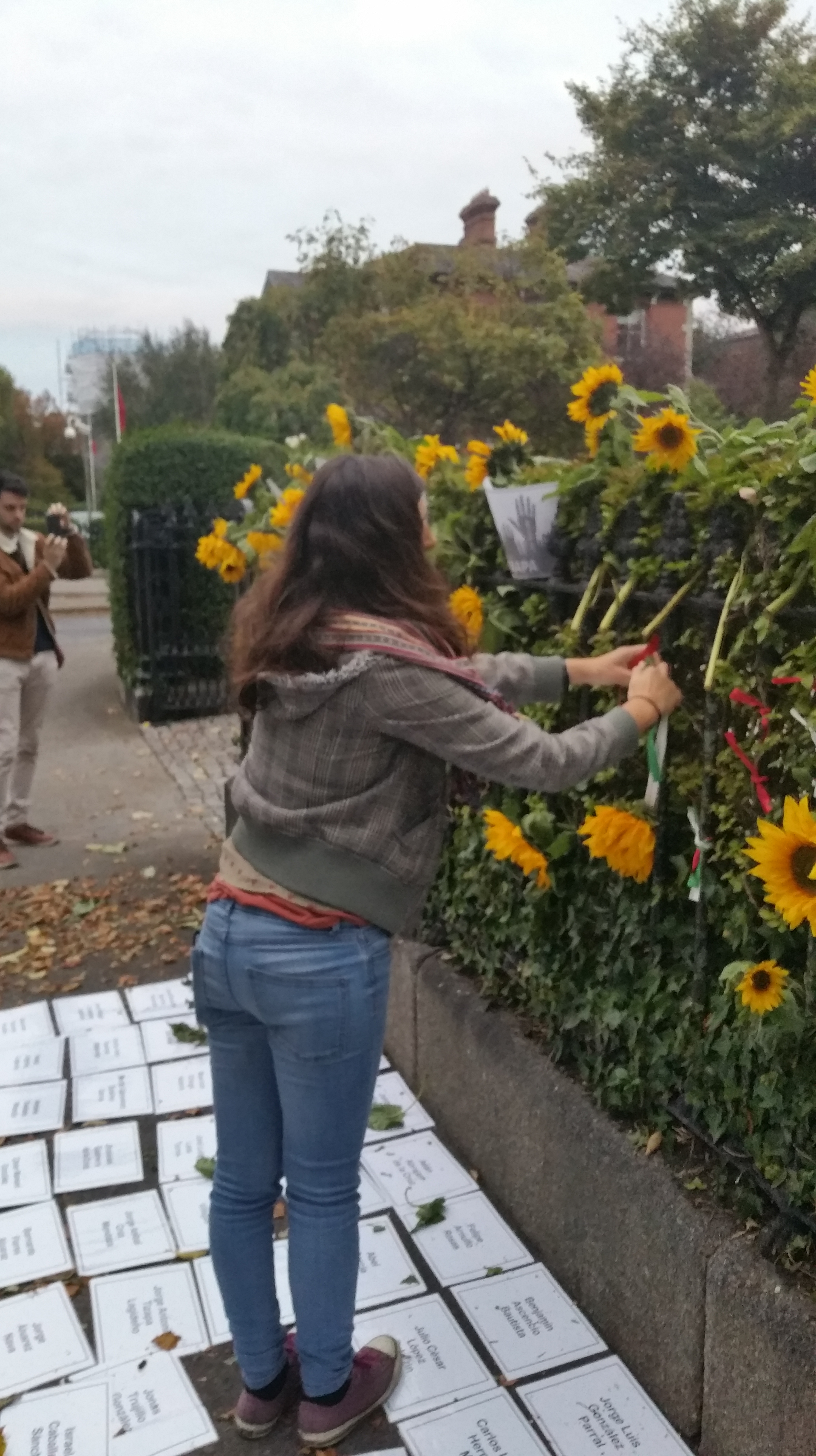 The event last night was organised by the Mexico Ireland Solidarity Collective (MISC) and Latin America Solidarity Centre (LASC). Sunflowers as a symbol of hope were placed in the railing of the Mexican Embassy in Raglan Road, Dublin and ribbons in the Mexican colours of green, white and red were also tied there. The names of the 43 “disappeared” students were laid on the pavement in front of the Embassy which, like the embassies of a number of other states, is located in a quiet upper-middle class area south of the Grand Canal. Few people passed the remembrance event and staff leaving the Embassy did not stop to talk to the gathering except for the last two who greeted them politely and took a photo of the display.