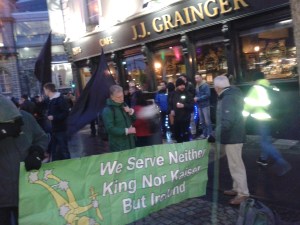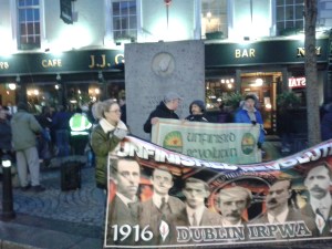 Having said that active denial of a public space for fascists is necessary, I would add that secret mobilisations should be for work that needs to be secret; however it is ludicrous to gather secretly and then to march out to stand in front of the fascists shouting at them. That work of visible opposition does need to be done but publicly, with mass mobilisations – antifascist forces should be able to outnumber the fascist and racist mobilisations in Ireland by a factor of ten to one. We should have effective amplification systems, play antifascist songs, and fly relevant flags (in particular, in my opinion, the Starry Plough, flag of the Irish working class in struggle in 1913 and in 1916).