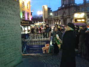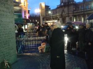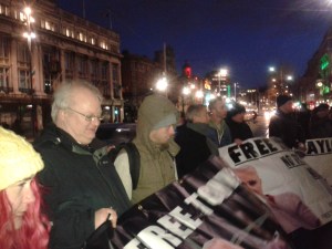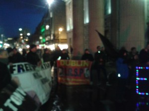 The march then formed up and, led by a floral wreath-holder and black flags, proceeded up Talbot Street, into North Earl Street and up to the GPO. Along the way they chanted“From Ireland to Palestine- Occupation is a Crime” and “Donald Trump/Theresa May- How many kids did you kill today?” The demonstration received a lot of support from passers by along the way and drivers of cars and buses who beeped to show support. The marchers, some of who were carrying candles or light up boards made there way to the GPO where a further crowd had already gathered.