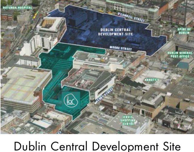 Two toxic waste spills for Moore Street? The Hammerson plan in dark blue and the existing Hammerson/ Irish Life/ Chartered Land ILAC centre in green. (Photo source: Internet).