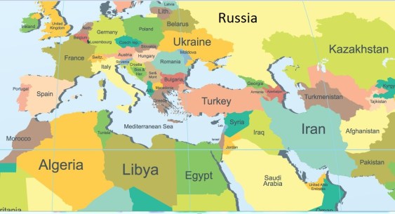 Map on which one can see the encirclement of Russia: Turkey in NATO, Ukraine is hostile to Russia, Georgia tried to break away, Afghanistan is occupied, Pakistan is hostile, Syria is embattled, Iran awaits. (source Internet)
