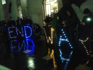 The march then formed up and, led by a floral wreath-holder and black flags, proceeded up Talbot Street, into North Earl Street and up to the GPO. Along the way they chanted“From Ireland to Palestine- Occupation is a Crime” and “Donald Trump/Theresa May- How many kids did you kill today?” The demonstration received a lot of support from passers by along the way and drivers of cars and buses who beeped to show support. The marchers, some of who were carrying candles or light up boards made there way to the GPO where a further crowd had already gathered.